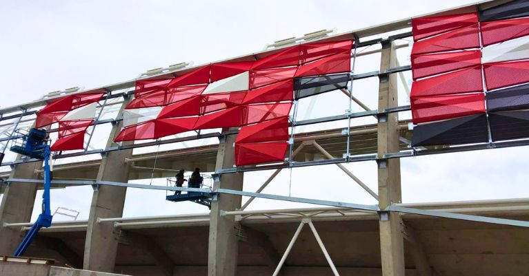 A stadion látványos homlokzatburkolatát az Electraplan Kft. készítette alumínium és acél alapanyagból. A burkolat porszórt bevonattal ellátott, expandált alumínium lemezből készült, ami a legmagasabb szintű nyugati design elvárásoknak is megfelel.